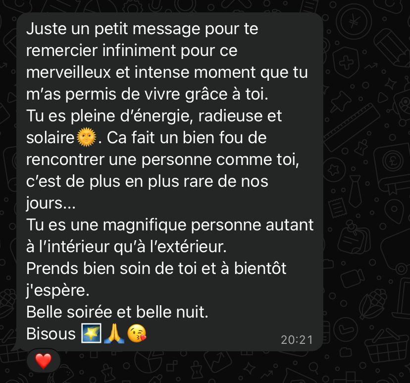 5. N’hésitez pas à poser vos questions avant de venir : nous sommes entre adultes, et je maîtrise parfaitement le français, rendant la communication fluide. Le massage Tantra est un espace de communication, d’ouverture et de confiance.